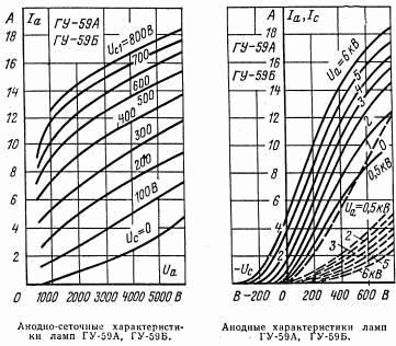 Мощный генераторный триод для работы в качестве генератора высокочастотных колебаний в промышленных генераторах для высокочастотного нагрева. Оформление — металлостеклянное. Рабочее положение — вертикальное, анодом вниз. Охлаждение — принудительное: ГУ-59А: анода — водяное не менее 12 л/мин, ножки — воздушное не менее 50 м3/ч, баллона — воздушное не менее 50 м3/ч; ГУ-59Б: анода — воздушное не менее 600 м3/ч, ножки — воздушное не менее 50 м3/ч, баллона — воздушное не менее 50 м3/ч. |