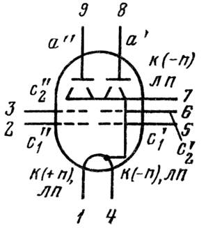 а — анод первого тетрода, а« — анод второго тетрода, с1 — сетка первая первого тетрода, с1« — сетка первая второго тетрода, с2 — сетка вторая первого тетрода, с2« — сетка вторая второго тетрода, лп — лучеобразующие пластины, к(+п) — катод (плюс нити накала), к(-п) — катод (минус нити накала).