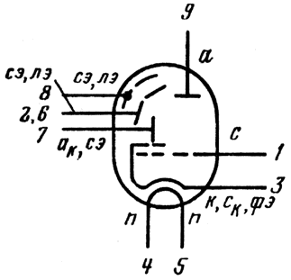 а — анод, ак — анод кратера, с — сетка, ск — сетка кратера, сэ — светящийся экран, лэ — лучеобразующий экран, фэ — фокусирующий электрод, к — катод, п — подогреватель катода.