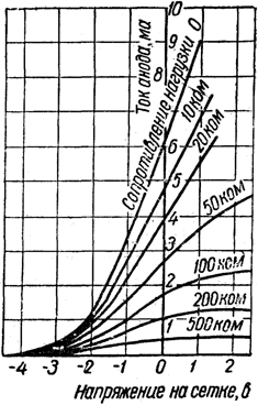 Динамические характеристики зависимости тока анода от напряжения на сетке и сопротивления нагрузки в цепи анода при напряжении источника анодного питания 250 В.