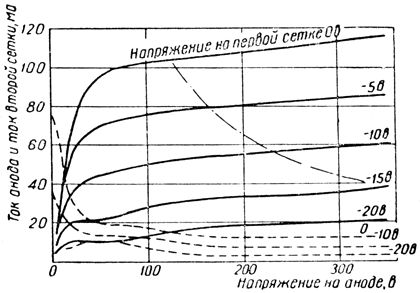Характеристики зависимости токов анода и второй сетки от напряжения на первой сетке