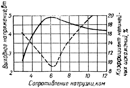 Характеристики зависимости выходной мощности и коэффициента нелинейных искажений от сопротивления нагрузки при напряжении на аноде 250 В, на второй сетке 250 В, напряжении смещения на первой сетке -12.5 В и напряжении сигнала 8.8 В