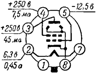 Примечание. Сопротивление в цепи первой сетки не должно превышать при фиксированном смещении 100 кОм, при автоматическом — 500 кОм.