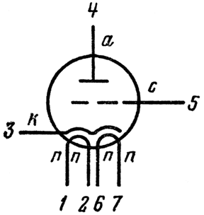 а — анод, с — сетка, к — катод, п — подогреватель катода.