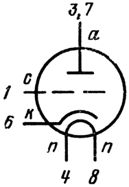 а — анод, с — сетка, к — катод, п — подогреватель катода.
