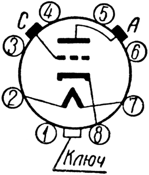 Схема соединения электродов лампы 6С8С со штырьками: 1 - не подключен, 2 - подогреватель, 3 - не подключен, 4 - не подключен, 5 - не подключен, 6 - не подключен, 7 - подогреватель, 8 - катод, А - верхний вывод анода, С - верхний вывод сетки. Импульсный триод 6С8С предназначен для генерирования колебаний высокой частоты в импульсном режиме. Лампа имеет причудливую форму: имеет 2 колпачка на баллоне — один из них является анодом, второй — сеткой триода скачать тех. документацию в формате PDF 6S8S.pdf