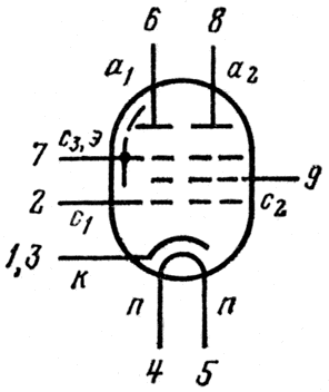 Миниатюрный высокочастотный пентод с двумя раздельными анодами повышенной надежности, радиационно-стойкий.